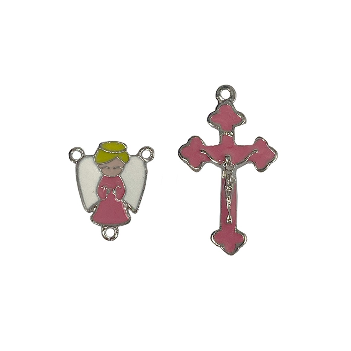 KT720101 - Kit Cruz e Entremeio Anjinho Rosa Níquel
