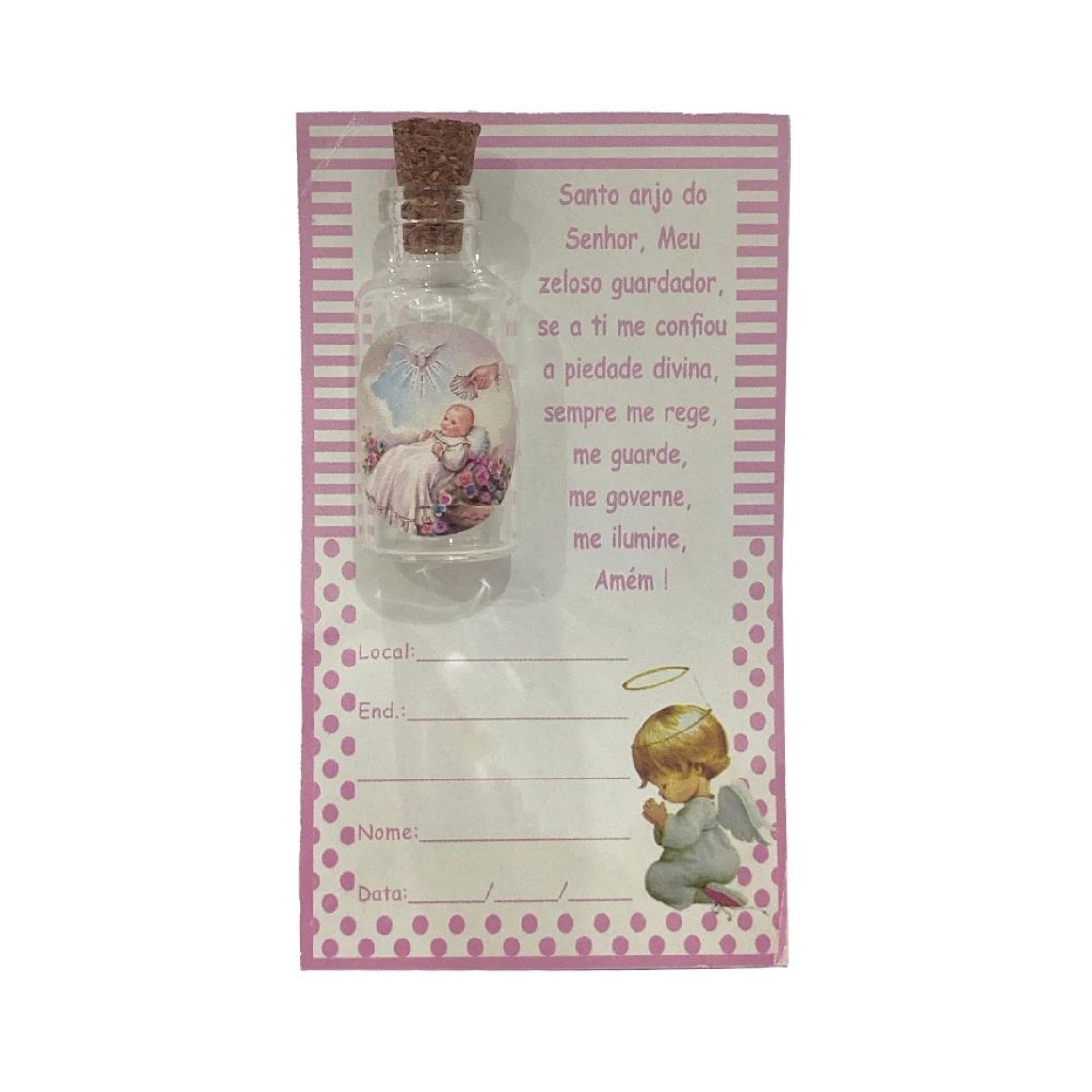 *Cartão Lembrança c/ Garrafa Batismo Rosa - 10,5x6cm.