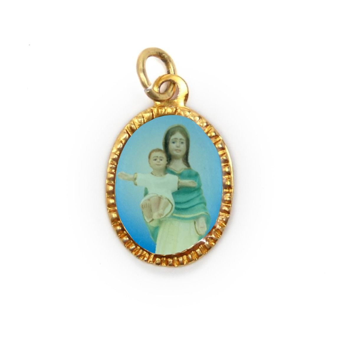 *Medalha de Alumínio Oval Dourada c/ 10un N. Sra. Do Sorriso - 2x1,3cm.