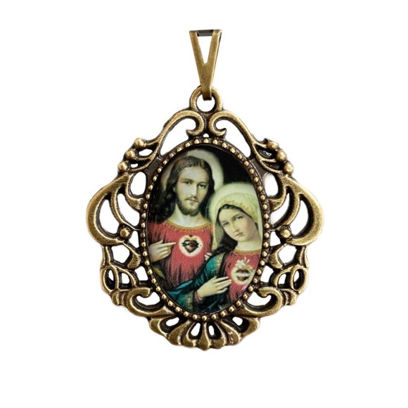 *Medalha Sagrado Coração de Jesus e Maria Camafeu Ouro Velho - 5,5x4,2cm.