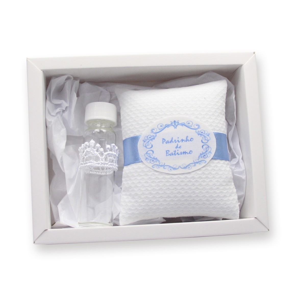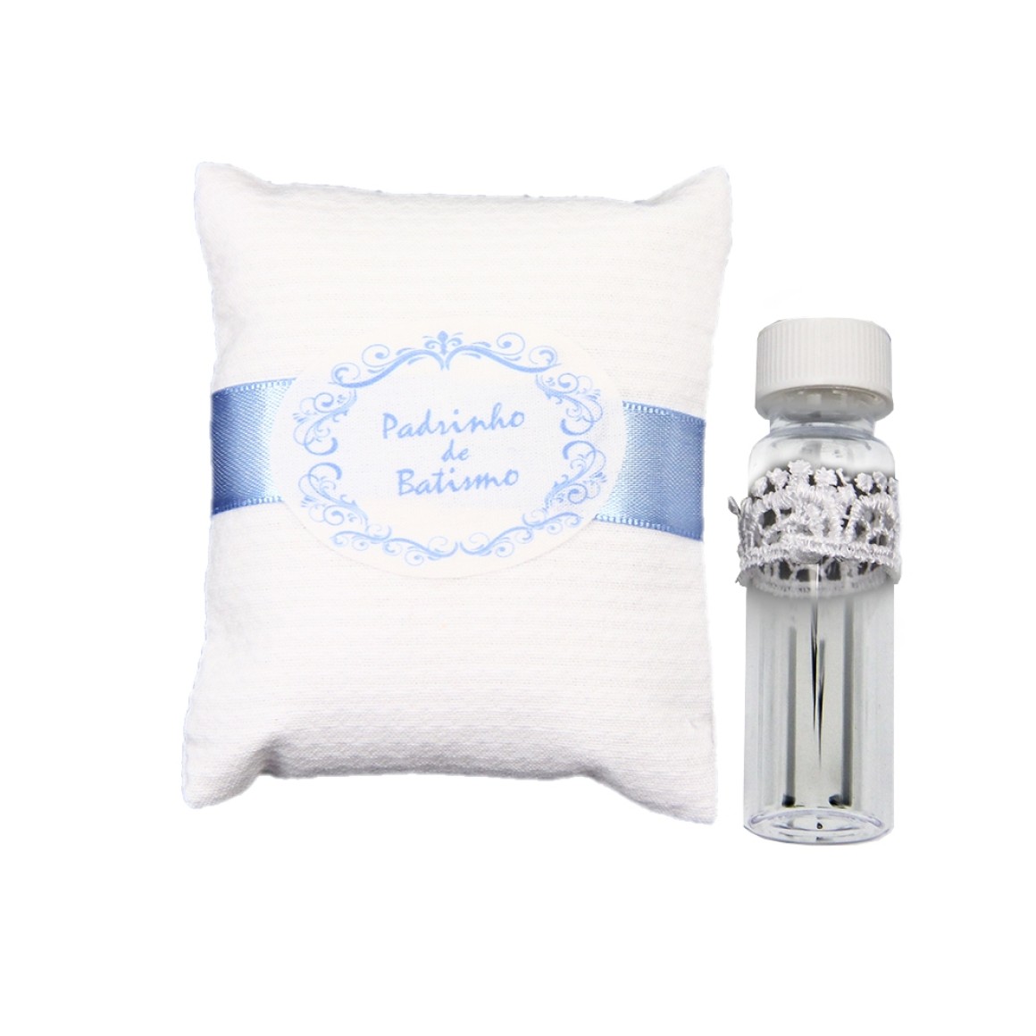 *Kit Batismo de Padrinho c/ Almofada e Vidrinho p/ Água Benta - 11x14cm.